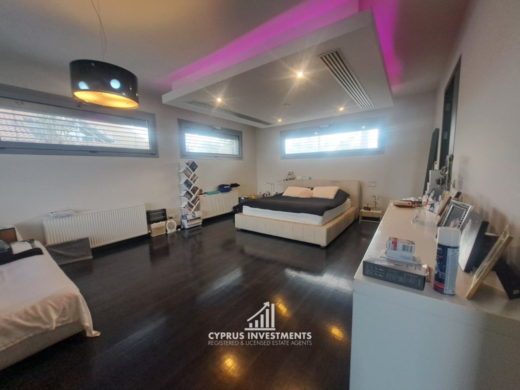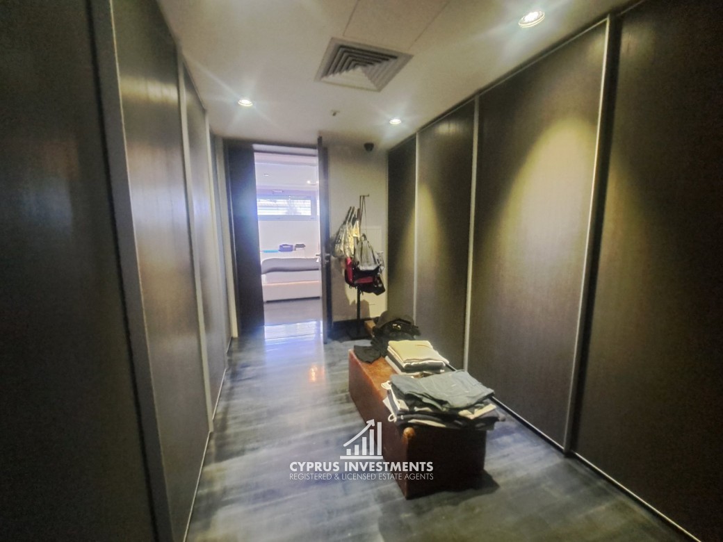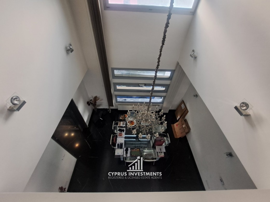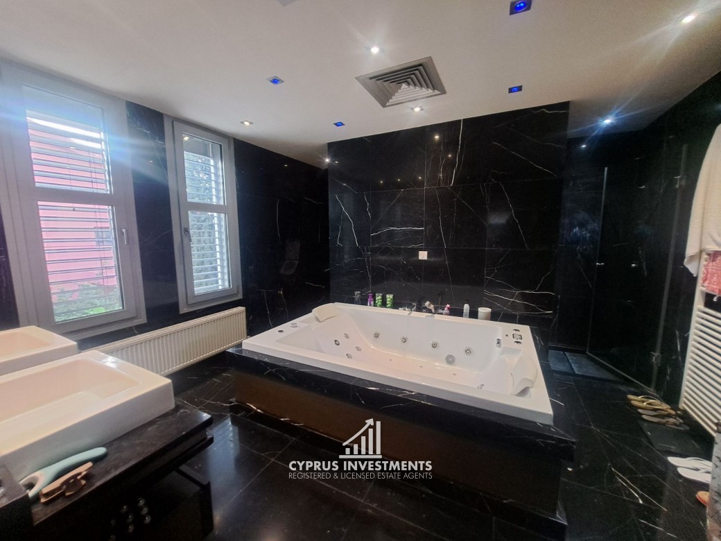 Additional features include a server room with a safety box, an office room, a cinema room, central heating, eight water closets, and a maid's condo complete with a bathroom and kitchen. The property is enhanced with thermo-insulated walls and windows, electric shutters, a soft water sanitation system throughout, a soundproof hydraulic lift, and a roof garden.