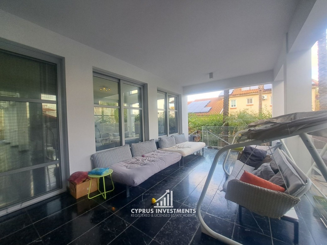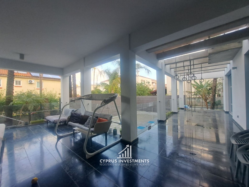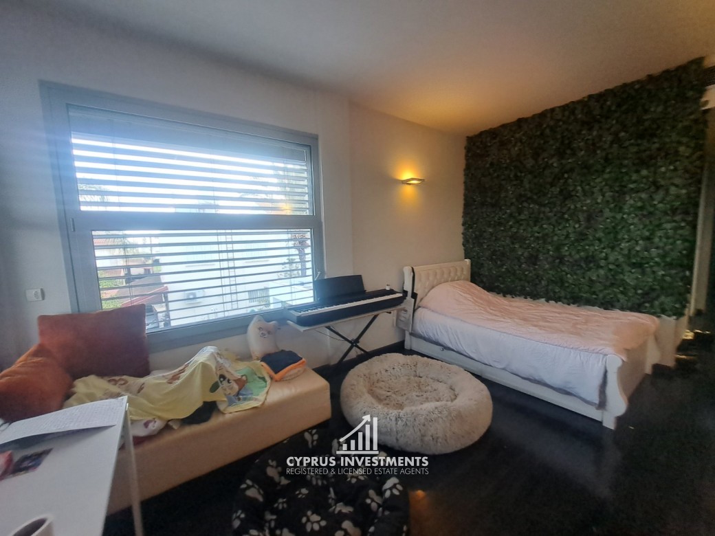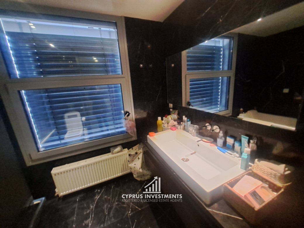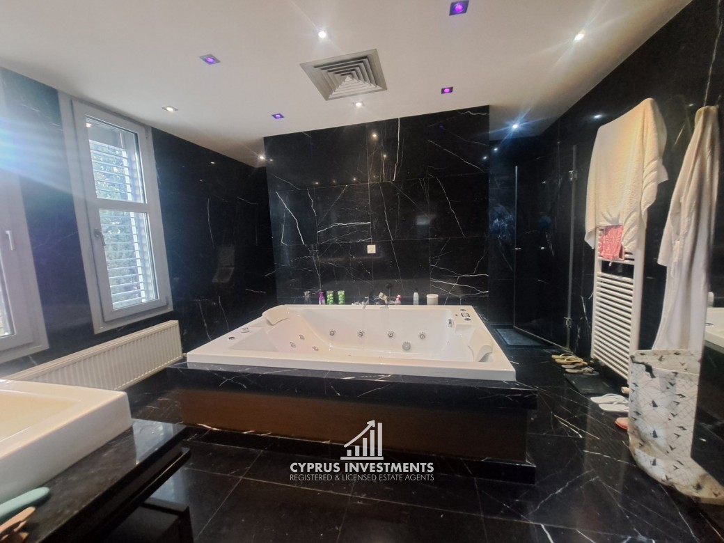 The home is fully air-conditioned, with floors crafted from black Nero Marguina marble that naturally breathes. Energy efficiency is a priority, with all lighting fixtures using LED technology and appliances rated 3AAA for energy savings. The salt-chlorinated swimming pool offers fiber-optic color-changing lights and an astral waterfall massager, complemented by surrounding wall waterfalls and a full electric safety cover.