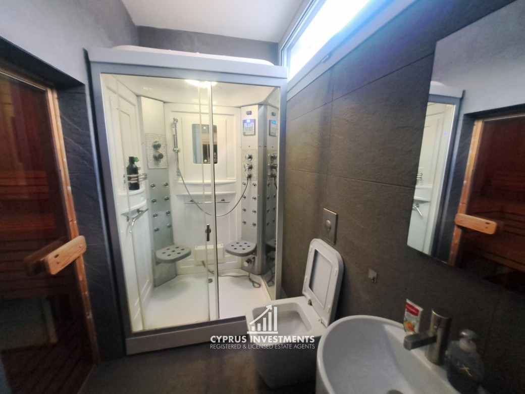 Security is ensured with a comprehensive security system and fire alarm. The property also offers four parking spaces, a storage room, satellite dishes, a Jacuzzi and sauna room, a steam bath, and a mature garden.